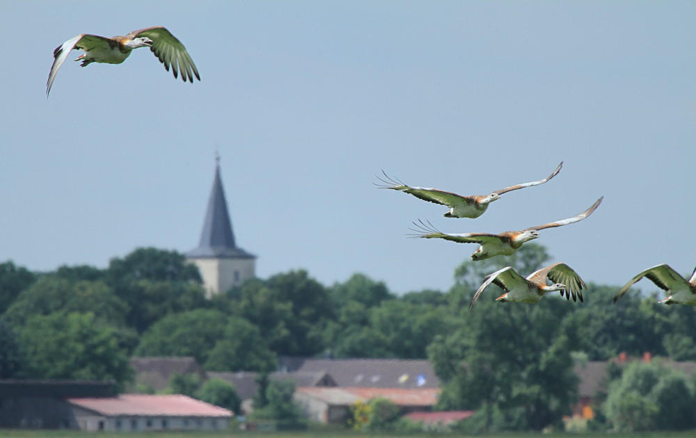 Beskrivelse: Havde på netfugl læst DOF-Storstrøms beskrivelse af tur til dette område. Vi gik efter stortrapper med store forhåbninger men små forventninger. Fik øje på "øglehoveder" langt ude i vegetationen. Tilfredse. Fik øje på en enlig han meget langt væk, som "skummede". Halepartiet op på ryggen, vingerne vendt 180 grader og "skægget" spredt. 50m fra hannen gik en enkelt hun. Meget tilfredse. Udenfor fotoafstand stod 8 stortrapper. Pludselig var de på vej mod os i stort tempo. Lander 120m bag tårnet. De fouragerer i 20min inden de letter og flyver videre. Vildt tilfredse. At tænke sig at hannen kan veje op til 16 kg og have et vingefang som en havørn, 2,40m. Synd at denne fantastiske art ikke yngler i Dk længere.