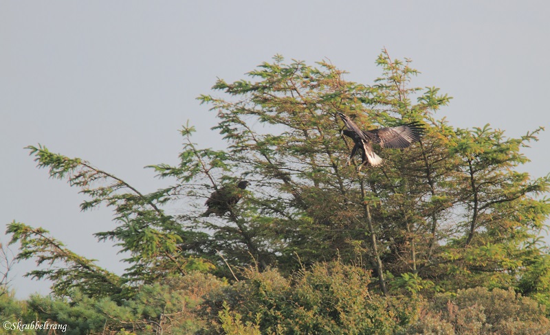 Beskrivelse: Ørnen rastede i skarvesøen, hvor den sad ganske fint. Gik på vingerne og jagtede alm. havørn fra nærliggende gran.