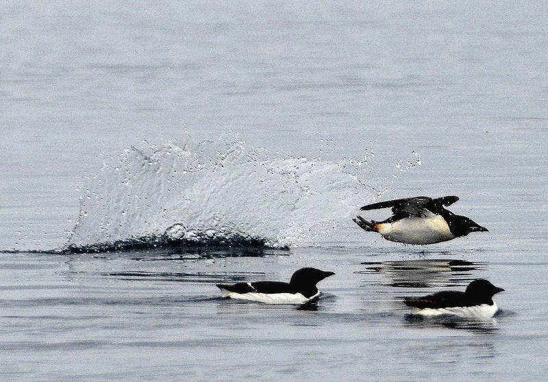 Beskrivelse: Et af en serie fotos, af en polarlomvies landingsteknik på vandet, hvor den lander med en maveplasker.