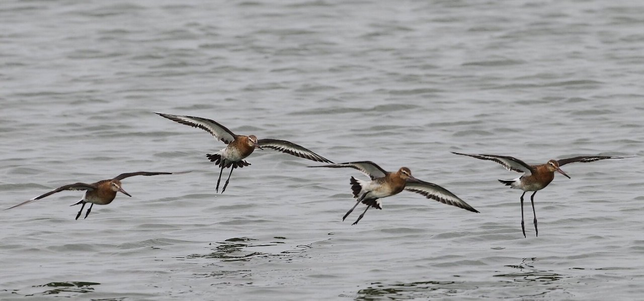 Beskrivelse: 4 Islandsk Stor Kobbersneppe, 1k lægger an til landing.