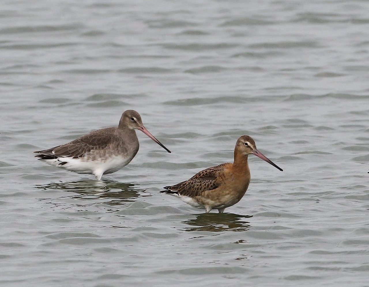 Vedr. fuglen til venstre, så tror jeg ikke det er en gammel fugl: Det er formentligt en 1k limosa at vurdere på dragtens friskhed. Ældre limosa påbegynder deres fældning allerede i maj-juni, og de flyver desuden tidligt til vinterkvarterene. Ser man ældre limosa sidst på sommeren, vil man kunne opleve, at de grå vinterdragtsfjer (som jo ellers skal holde hele vinteren) allerede er let pjuskede og ujævne.