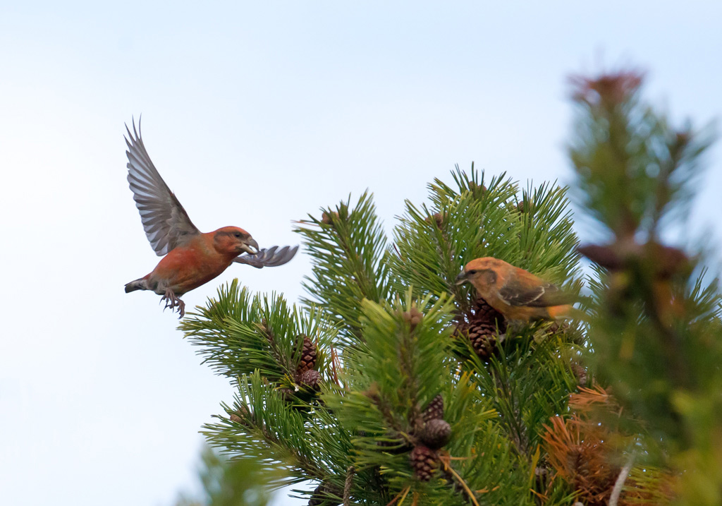 Beskrivelse: Fuglen til højre må vel være den i litteraturen nævnte: 'Hvidbåndet Lille Korsnæb'...?