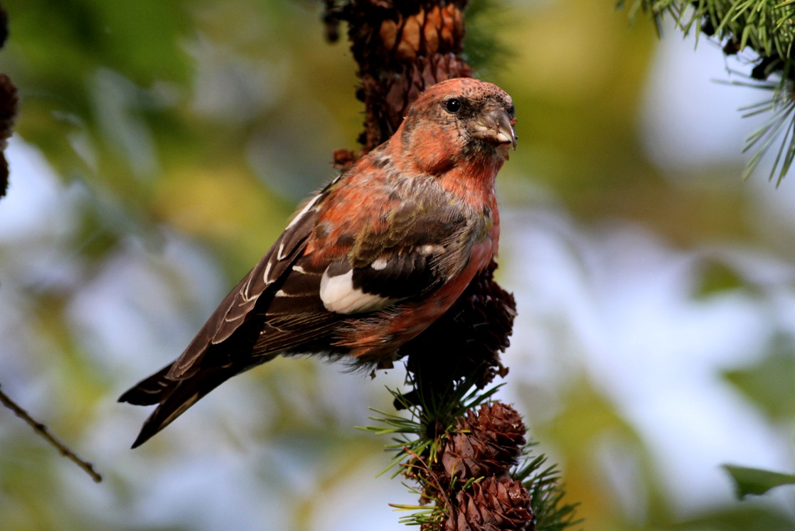 Beskrivelse: 5 1K hvidvingede korsnæb blev i dag set på klods hold i lærketræerne på Nordhusvej.