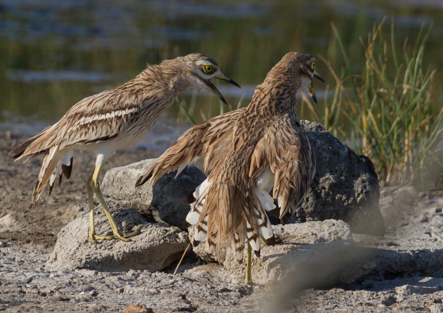 Beskrivelse: Triel er på én og samme gang en utroligt grim, og utroligt fed fugl i mine øjne. Billedet her viser 2 fugle der spiller op til hinanden - ikke just et kønt syn. Men der er nu alligevel noget ved dem - de enormt store gule øjne, og de utilpasset lange ben gør dem bare særegne på den fede måde...