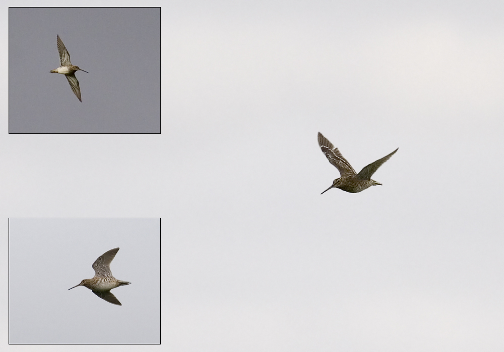 Beskrivelse: Showing underwing of Great Snipe on the small picture in the lower left corner and with a small picture of the underwing of a Common Snipe in the upper left corner for comparison.