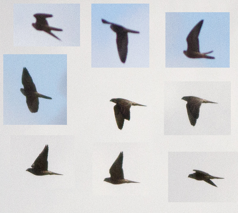 Beskrivelse: Havde lige set 2 forskellige Vandrefalke da denne fugl kom op. Virkede umiddelbart større og langhalet, uden tydelig skægstribe og kontrast på siden af hovedet, fornemmede kontrast i undervinger. Smed håndkikkerten og fik disse billeder inden fuglen forsvandt. Håber nogen af eksperterne kan lave en sikker bestemmelse ud fra billederne??