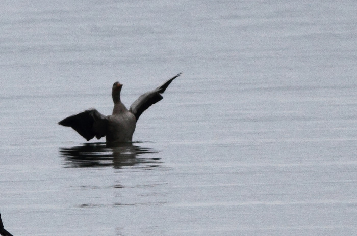 Beskrivelse: Jeg så denne spøjse sag fra tårnet. Den er meget lille. På et tidspunkt lå den sammen med en Toppet Lappedykker og virkede ikke ret meget længere i kroppen end denne.Den er storhovedet med "tykke kinder" Den stejle pande kunne godt pege i retning af Dværggås, hvorimod vingetegningen er meget som Grågås.