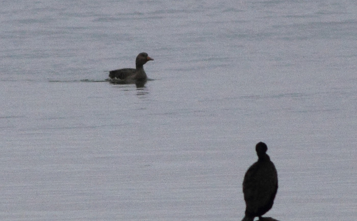 Beskrivelse: Jeg så denne spøjse sag fra tårnet. Den er meget lille. På et tidspunkt lå den sammen med en Toppet Lappedykker og virkede ikke ret meget længere i kroppen end denne.Den er storhovedet med "tykke kinder" Den stejle pande kunne godt pege i retning af Dværggås, hvorimod vingetegningen er meget som Grågås.