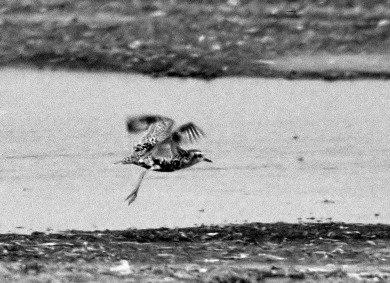 Bemærk her under opflyvning: Lange ben (Rørhøne-lignende) og forholdsvis langt næb. Hvidlig flankestribe i kontrast til smudsig-grå undervinge.