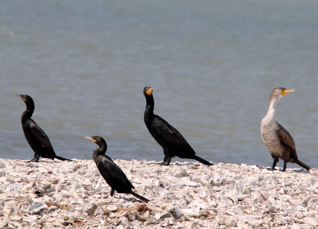 Beskrivelse: Left side two Neotropic Cormorants - at the right Double-crested Cormorants - adult and 1cy.