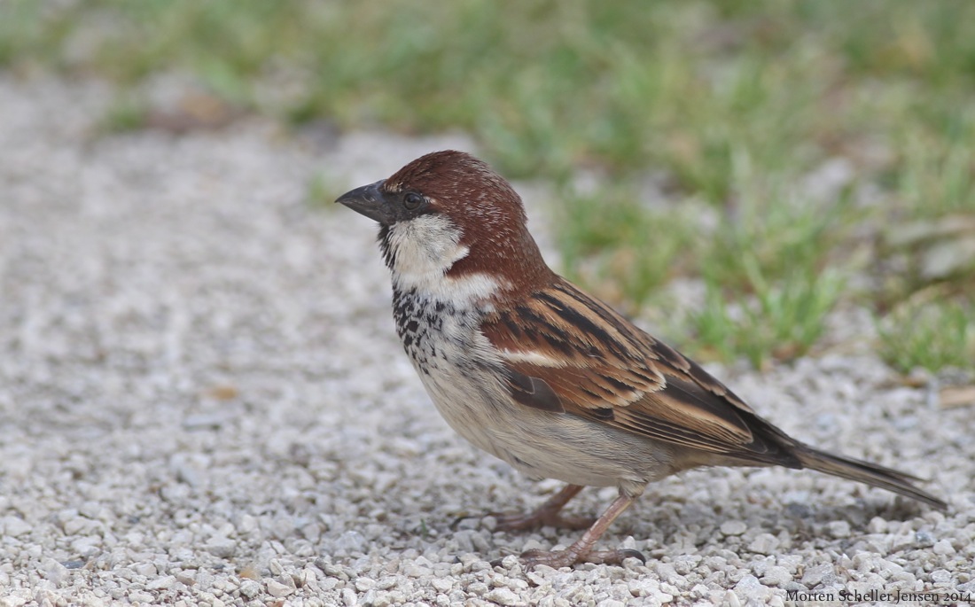 Beskrivelse: Italiensk Spurv ligner Gråspurven men har brun kalot og sortspættet bryst ala Spansk spurv