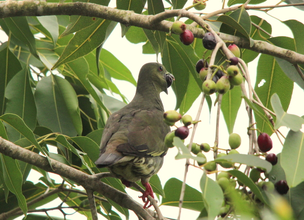 Beskrivelse: Seen in coastal wood and mangrove. A canopy dweller - both eating and resting. Here shot from a 'bird-tower'.