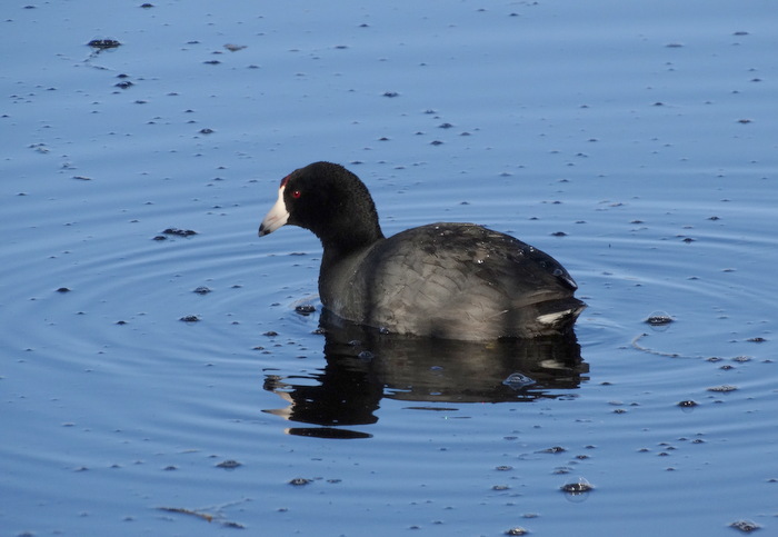 Beskrivelse: Sort ring på næbbet, røde knopper i panden og hvide underhaledækfjer afslører, at det ikke er en hjemlig Blishøne