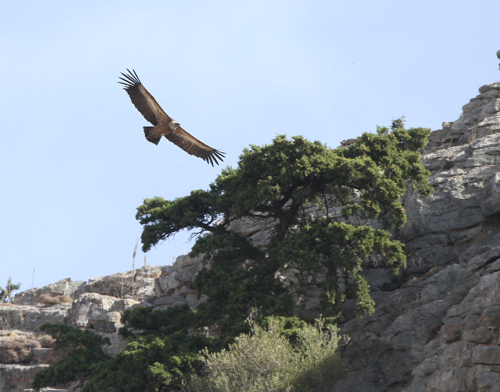Beskrivelse: Så kom den endelig tættere på. Efter vandring på hede klippeskråninger virker Gåsegribbens ankomst helt rigtig. Denne stillesvævende kæmpe. 270cm er stort tæt på.