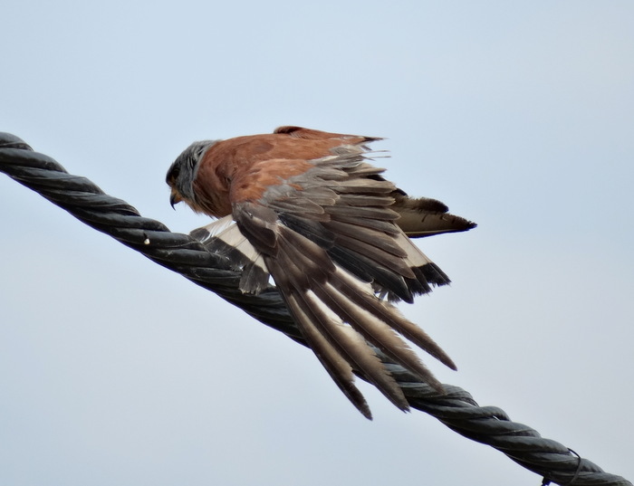 På billedet ses en gammel han, med meget slidte og blegede sving- og halefjer.