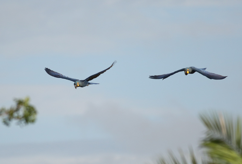 Beskrivelse: De blå araer er blandt Sydamerikas mest fåtallige arter. en regnes allerede som uddød, en anden er uddød i naturen men forsøgen genudsat, og så er der Lear´s Macaw, med en bestand på ca. 750 fugle, der alle findes i Canudos-området. Den største art, Hyasinth Macaw er den mest udbredte, og ses bl.a. let i Pantanal, men er fortsat en truet art.