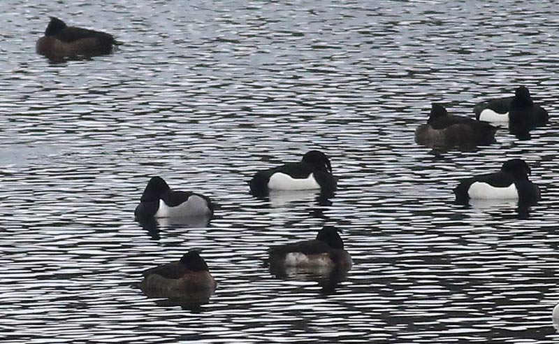 Beskrivelse: Hvis mønsteret fra de tidligere vinter gentager sig - hvilket forudsætter, at det er den samme fugl, der nu igen huserer i Nordsjælland - vil anden dukke op på flere forskellige steder, hvorfra den hurtigt forsvinder igen. Da flokke af Aythya-dykænder tilbringer store dele af dagen sovende, er det sin sag at finde Halsbåndstroldanden i de store troldandeflokke. Som det ses her er der ingen grund til at opgive: hannens grå flanker er i meget stor kontrast til hvide forflanker, der virker som en stribe, der strækker sig lidt længere op mod nakken end hos troldænderne. Desuden er hovedformen typisk, næsten pyramideagtig med bredere basis, men tyndere top end hos troldænderne, hvis nakketop yderligere forstærker indtrykket af en ret bred isse - sammenlign med de omkringsvømmende troldænder.