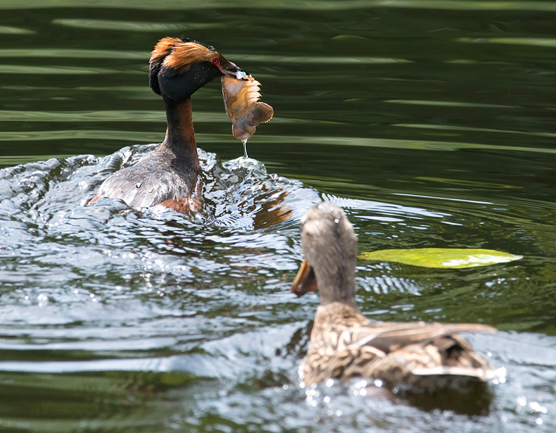 Beskrivelse: Lappedykkeren havde fået fat i en Flodkrebs, eller noget af den, som også Gråanden viste stor interesse for. Jagten stod på længe. Kom Gråanden for nær, dykkede Lappedykkeren ned med byttet.