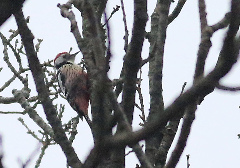 Beskrivelse: Mellemflagspætten, der sikkert bliver februars store tilløbsstykke, holder primært til i skovens vestlige del - lige hvor den grænser ud til hovedvejen. Den foretog i dag desuden en flyvetur til en gård ca. 300 m vest for skoven, hvor den en tid sås i de stedlige, ret åbne egetræer. Dette foregår nær privat bebyggelse, men ejeren, som vi talte med i dag, var meget venlig og imødekommende - en gæstfrihed, der ikke skal misbruges. God jagt!