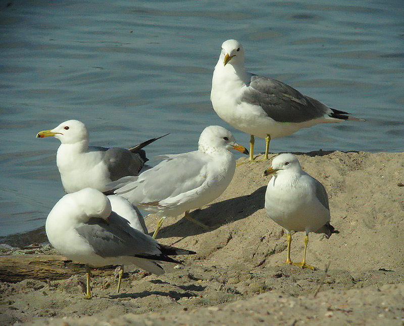 Beskrivelse: Bagved 2 ad Canadamåge, foran 2 ad Ringnæbbet Måge, og i midten en imm Ringnæbbet Måge med MEGET orange næb med sort spids uden hvid tip. Vel en 2cd summer (3K) fugl at dømme efter næbbet, lidt mørkere iris, brunlige store vingedækfjer og en smule brunlige mærker på flanken, men ellers tæt på udfarvet.
