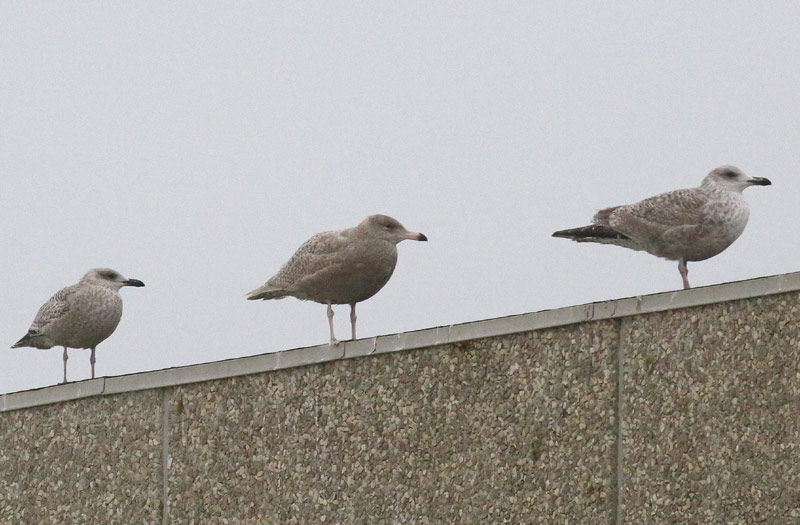 I øvrigt: meget mørkbrystede -og mavede fugle som denne med det tydelige tændstiksnæb vil - hvis vi vender tilbage til at se dem direkte forfra - ligne overbelyste udgaver af Amerikansk Sølvmåge ungfugl, der har ensartet "fløjlskrop" på undersiden som Gråmågen, men typisk langt mørkere, og ofte i kontrast til lysere hoved; næbbet kan ligne Gråmågens, men er normalt kortere end på denne fugl.