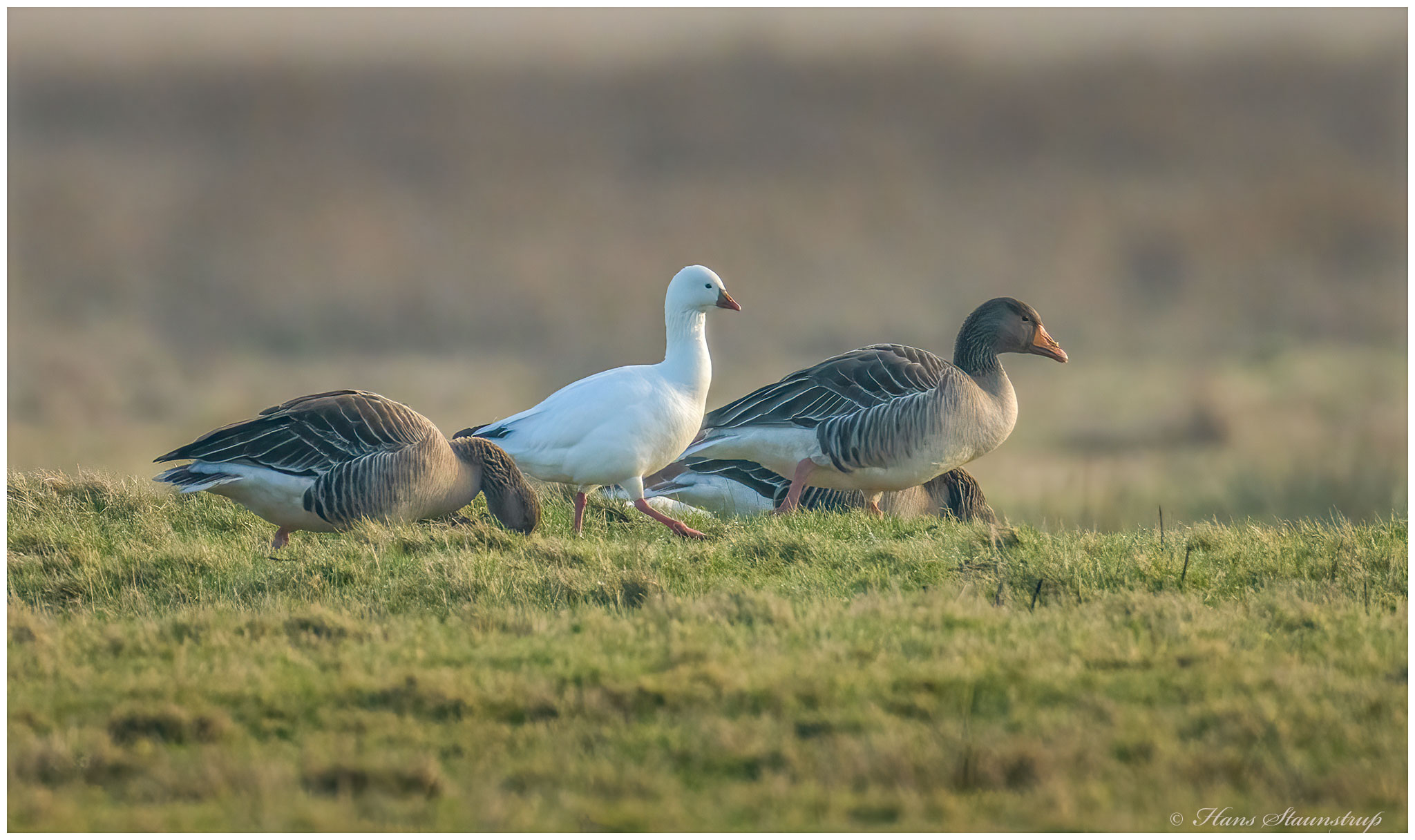 Vi stoppede ved en tilfældig gåseflok efter at have forladt motorvejen. Jeg kiggede ud og meldte tre hvide fugle. De gik med hovederne nede og da de var meget små i forhold til Grågæssene, var min første tanke, at det var hvide tamænder. <a target='_blank' href=' http://www.netfugl.dk/profiles.php?id=showprofile&profile_id=1900'>PAC</a> så først hovedet på dem og sagde derefter ”Ross Geese”. Det blev fuglene lidt mere spændende af og PAC fik lige spurgt til artens status i DK. Jeg tog nogle hurtige billeder og vi hoppede ud af bilen for at se dem i teleskop. I teleskopet afsløredes det hurtigt, at de alle var mærket med blå farveringe. <a target='_blank' href=' http://www.netfugl.dk/profiles.php?id=showprofile&profile_id=4512'>Julien Mazenauer</a> mente at kunne erindre, at 3 undslupne Ross Geese var set på Texel, så det var nok ikke værd at sætte sin lid til, at der var et blåringsprojekt af denne art i US. Fuglene lettede hurtigt efter, at vi kom ud af bilen. De blev set fra Marsk Stigs Vej. De var ikke så "blånæbbede" som arten kan være, men der kunne ses en blålig toning på den inderste del af næbbet.