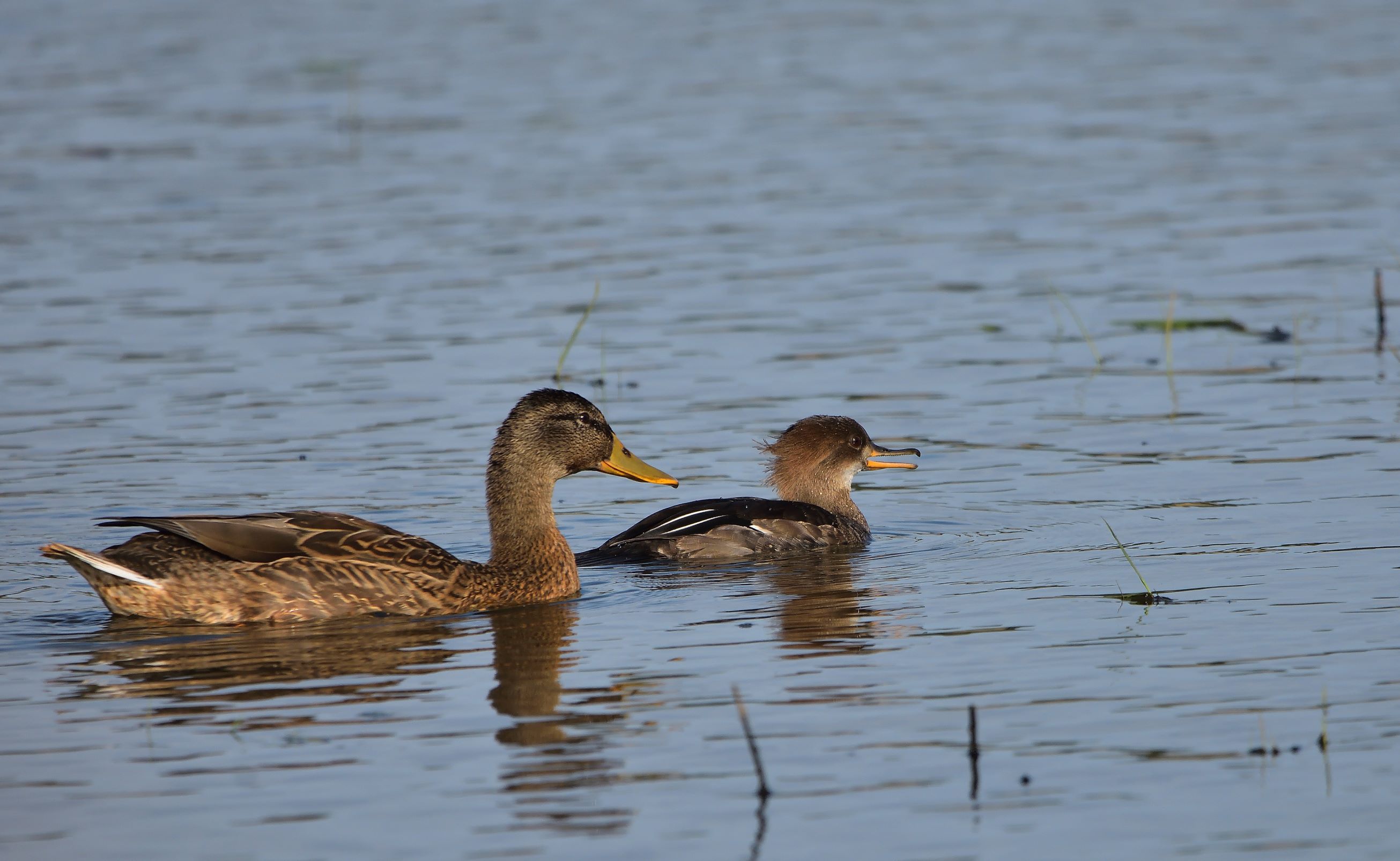 Beskrivelse: Ænderne ved tydeligvis, at ræven lider af vandskræk og lod sig ikke anfægte det mindste af dens tilsynekomst. Efter at have luret inde bag rørene i nogen tid, kom Mikkel frem og måtte nøjes med en tår vand.