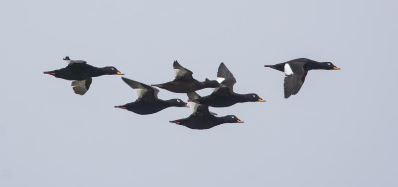 Beskrivelse: Sibirisk fløjlsands karakteristiske hovedprofil er måske det kendetegn, som er lettest at se hos en forbiflyvende fugl i en flok fløjlsænder?