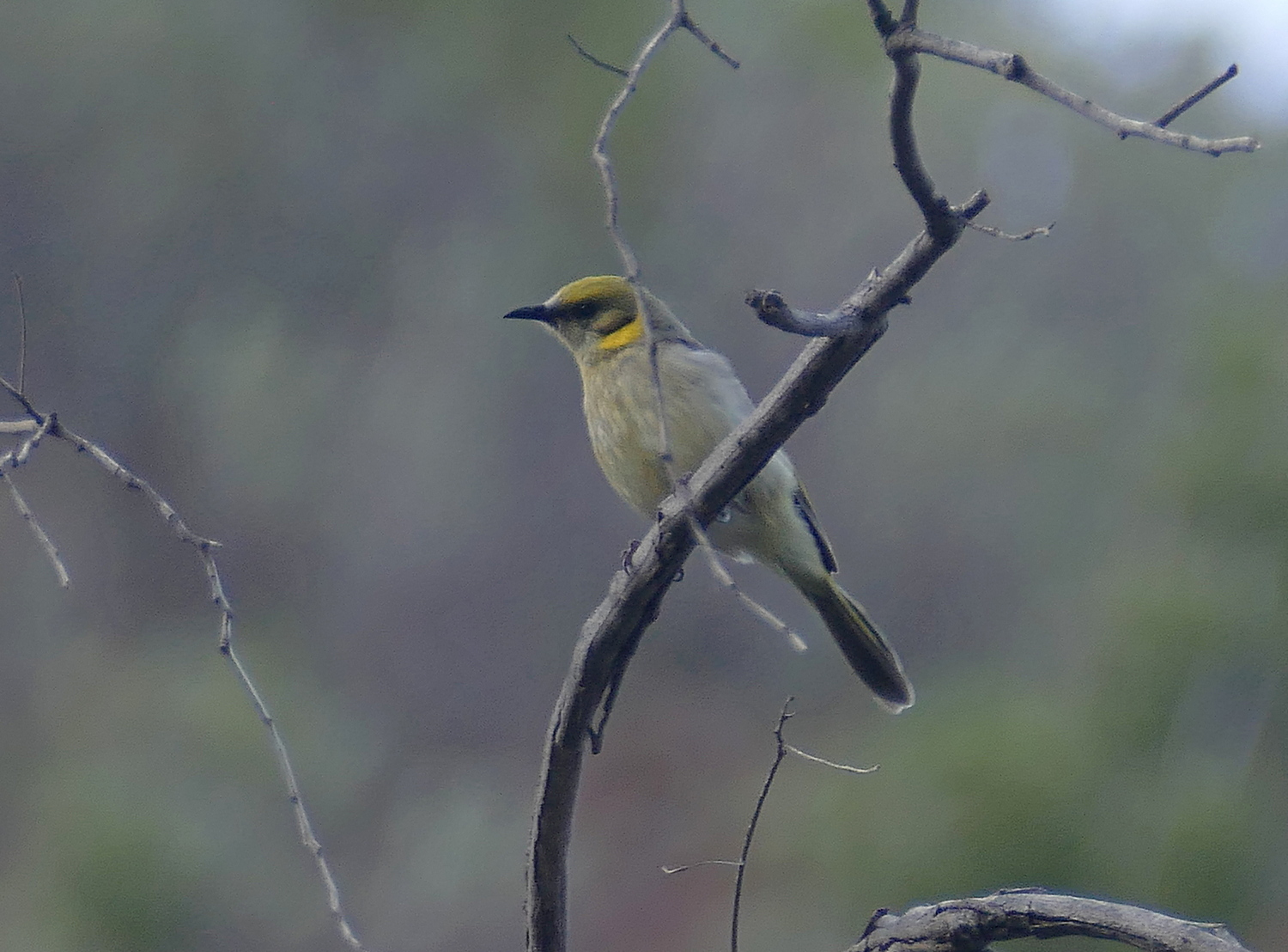 Beskrivelse: Grey-fronted Honeyeaters navn kommer af den lillebitte grå 'blis', som man næsten skal anstrenge sig for at se.