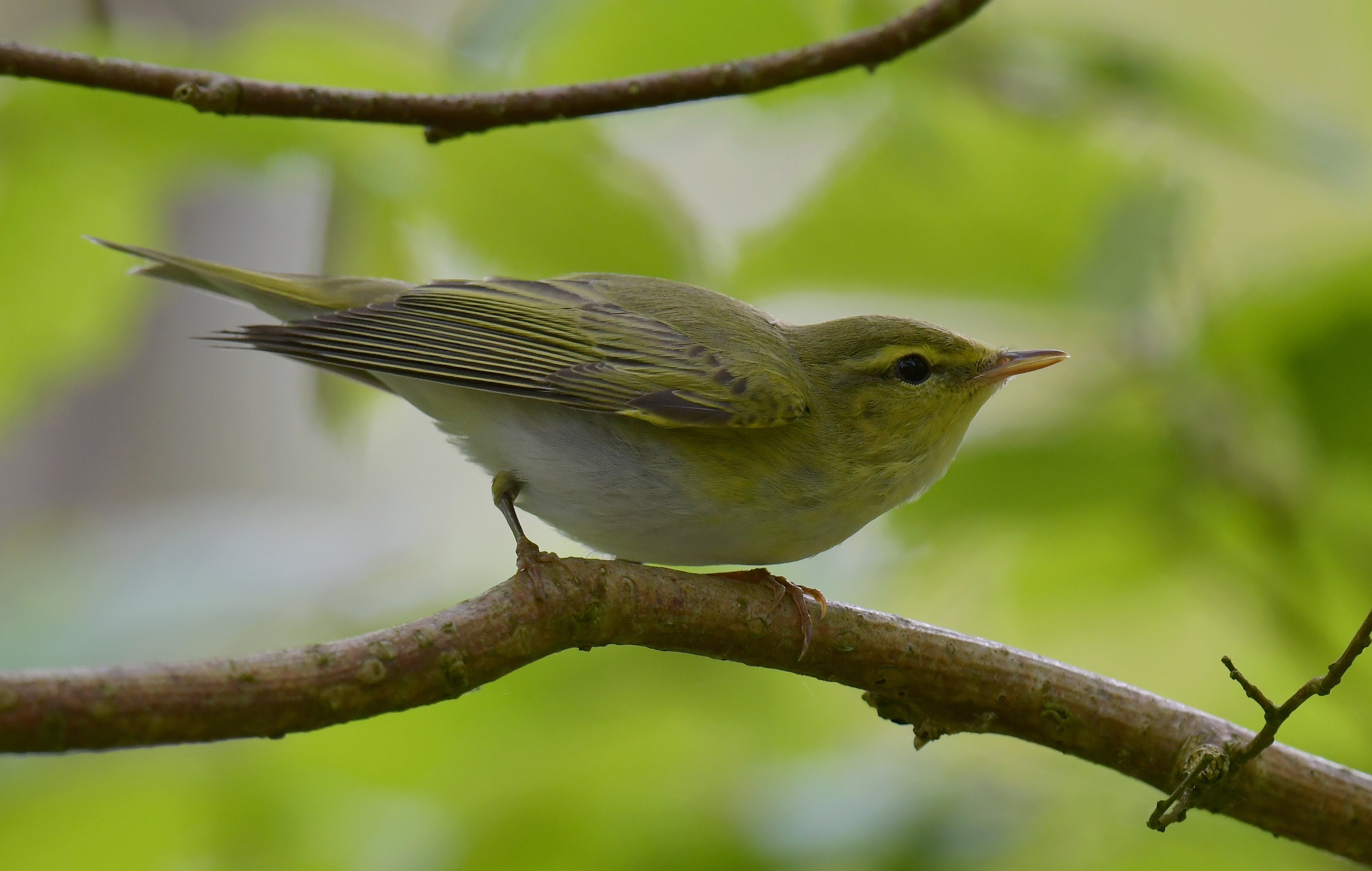 Beskrivelse: 3 skovsangere på lokaliteten, og denne satte sig heldigvis i et af de få solstrejf i den ellers meget mørke skov.