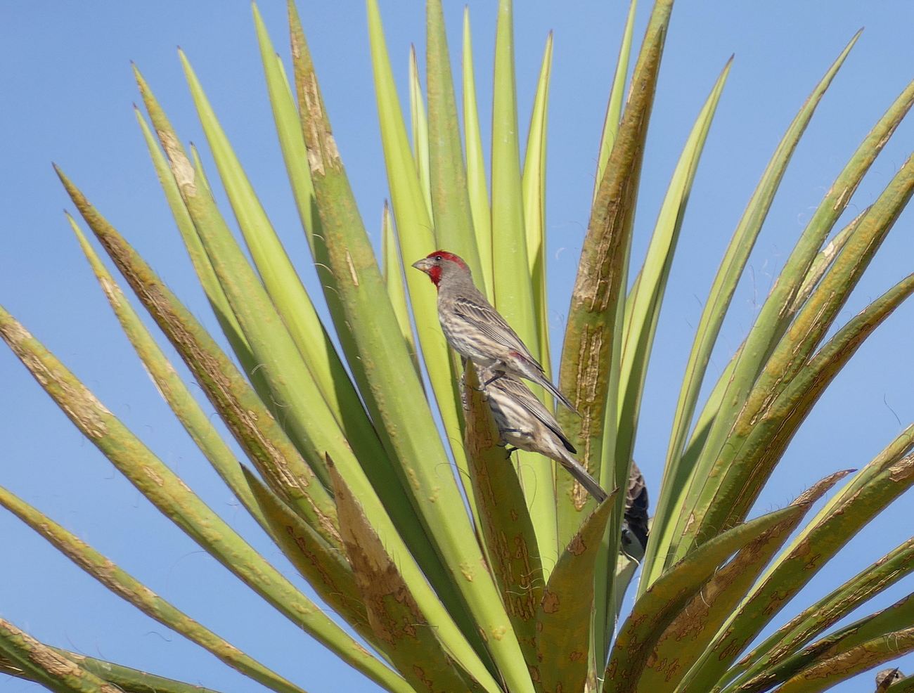 Titel: Pair of House Finch perching on palm.