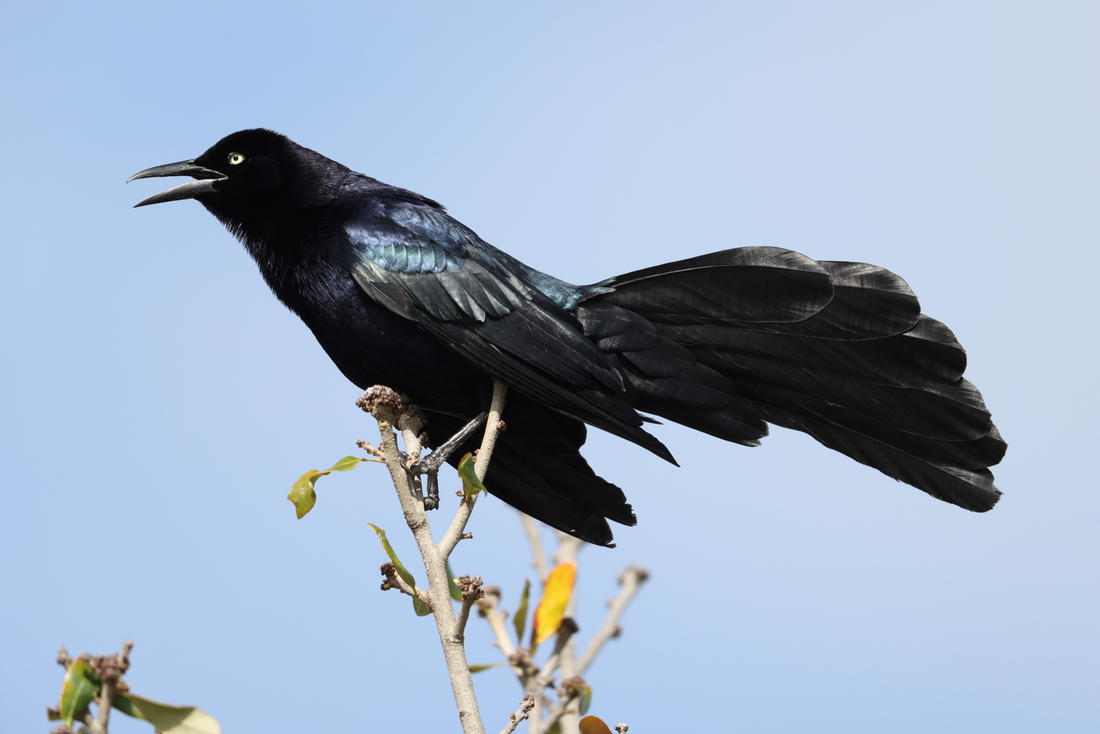 Beskrivelse: Great-tailed Grackle imponerer med sin flotte metalglans og den ejendommelige, skarpt opsammenfoldede hale, som man nærmest kan stille et brev i.