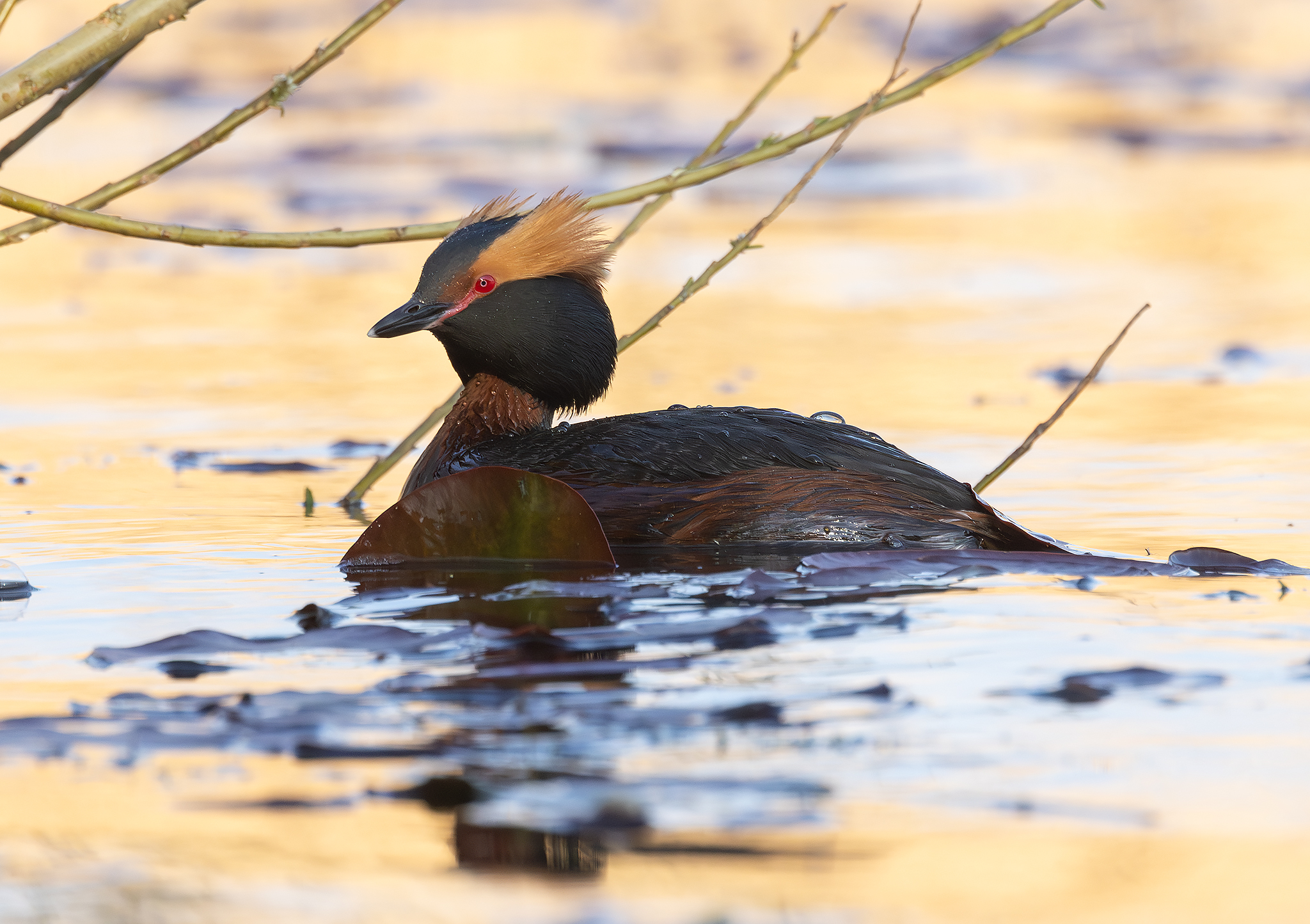 Beskrivelse: Nordisk Lappedykker,han i gang med dens vandgymnastik. I selve Kyrktjärn ynglede der 3-4 par Nordiske Lappedykkere, som gjorde pladsen trang , sådan at andre par ynglede udenfor søen. Denne han ynglede slet ikke, selv om den var i et parforhold , og dette kunne ses på begge fugle, som stadig var i fuld yngledragt. Hvorimod hos områdets andre individer var fjerdragten begyndt at falme kraftigt, så deres guldører / ananasstykker kunne næsten ikke ses mere.