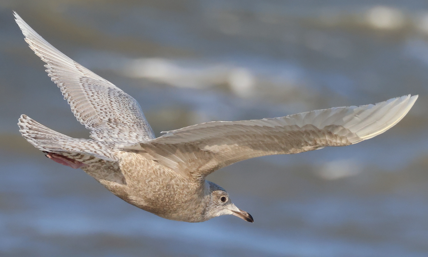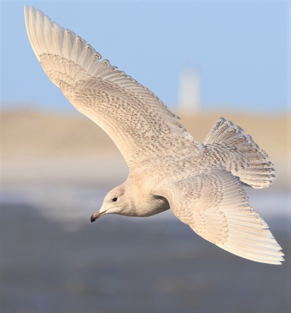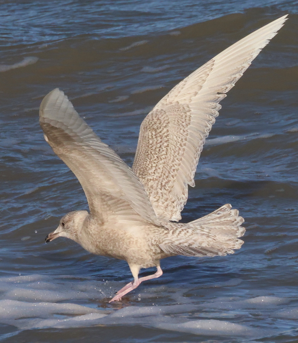 Beskrivelse: Hvidvinget Måge i 3. vinterdragt. Læg mærke til den fine grå, men ret skarpt afsatte tegning på yderfanen af yderste håndsvingfjer. Havde fuglen været fuldt adult havde dette været kendetegn for "kumlieni", som kan regnes som en overgangsform/hybridsværm mellem Thayers Måge (vist kaldet Iniutmåge af DOF). Tilsyneladende kan udflydende mørke tegninger i håndsvingfjerene ses hos en del immature Hvidvinget, men det er dog ikke endeligt afklaret om, hvorvidt disse fugle med mørke tegninger i hånden stammer fra Grønland(hvor Hvidvinget Måge, glaucoides yngler) eller hos fugle, hvis oprindelsesområde ligger længere vestpå, i arktisk Canada. Eftersom ren Hvidvinget som adult og juvenil bør mangle mørke vel afgrænsede tegninger i vingespidsen, kan denne fugl godt nævnes som mulig "kunmlieni" - den mørke tegning i yderste håndsvingfjer er definerende for "kulieni" i adult dragt.