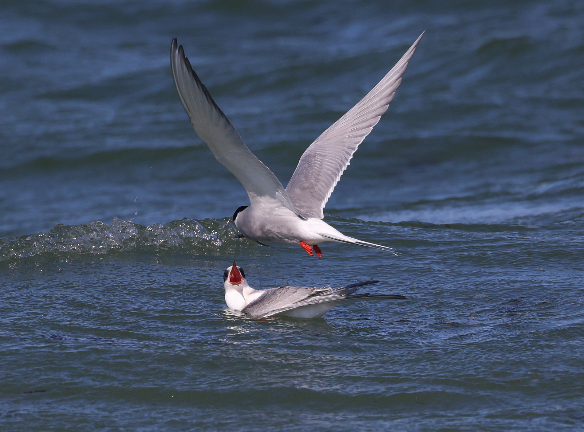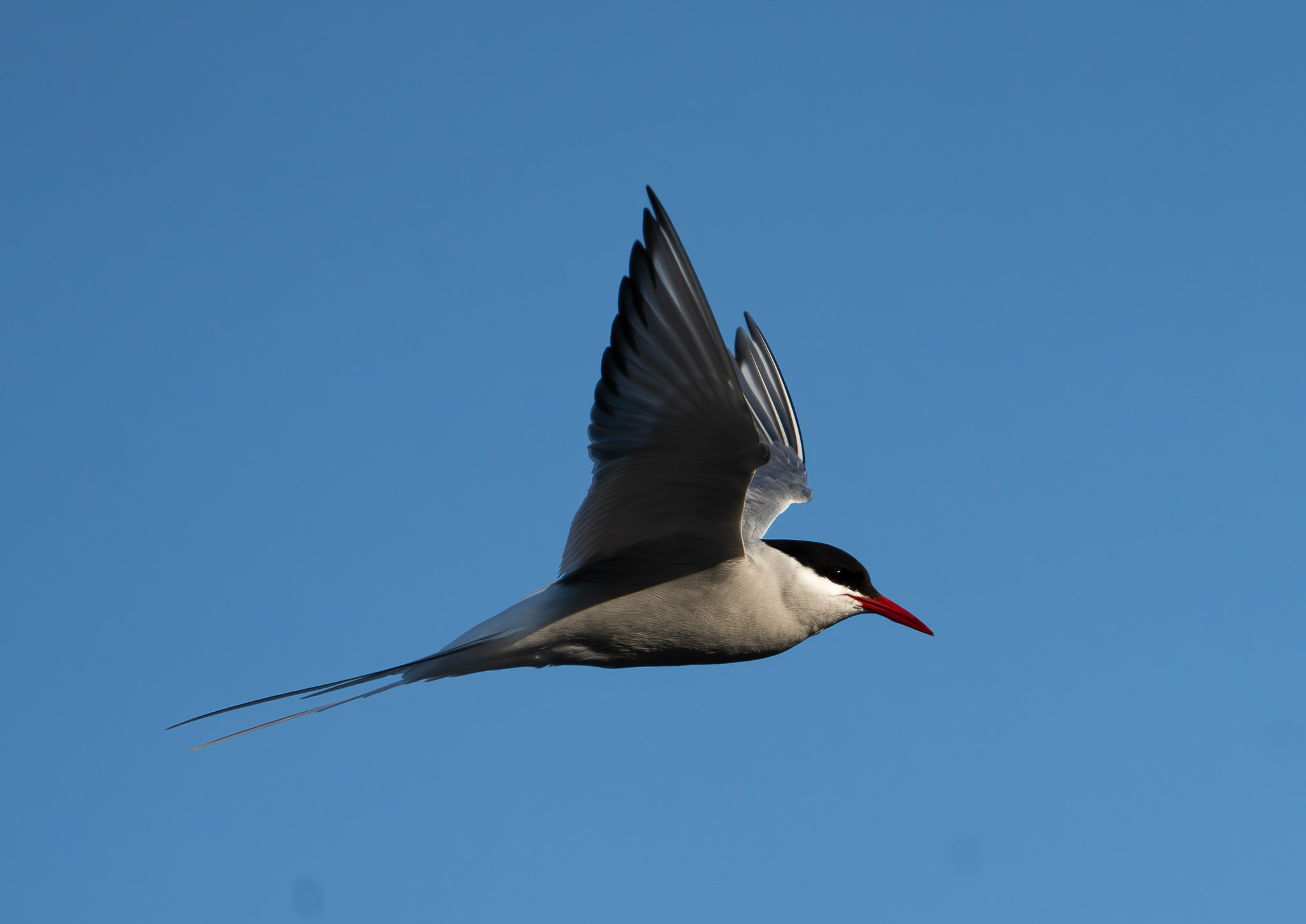 Fjordterne til venstre har længere næb med orangetonet inderdel af undernæbbet, længere ben samt lysere dækfjer i større kontrast til mørk vingeforkant, samt mørkere svingfjer.