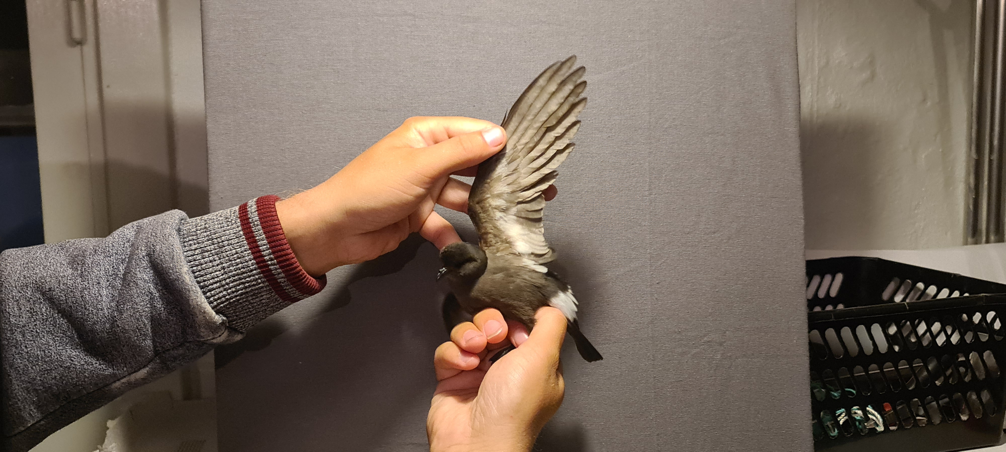 Beskrivelse: Skagen Fuglestation har knækket koden til hvordan man fanger lille stormsvale i Danmark. Denne fugl er den tredje fanget indenfor en uge. Foto taget uden blitz aht. fuglen.