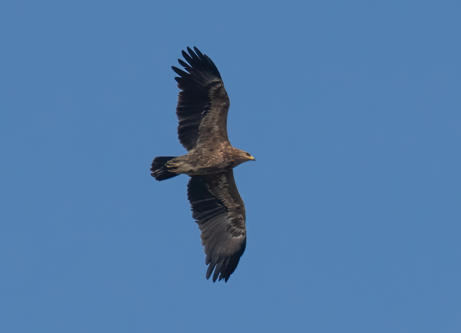 Kun undersiden set mod lys himmel. Nedbøjet hånd med spredte håndsvingfjer. Brede vinger. Undervingen med lysere dækfjer end hånd- og armsvingfjer.
