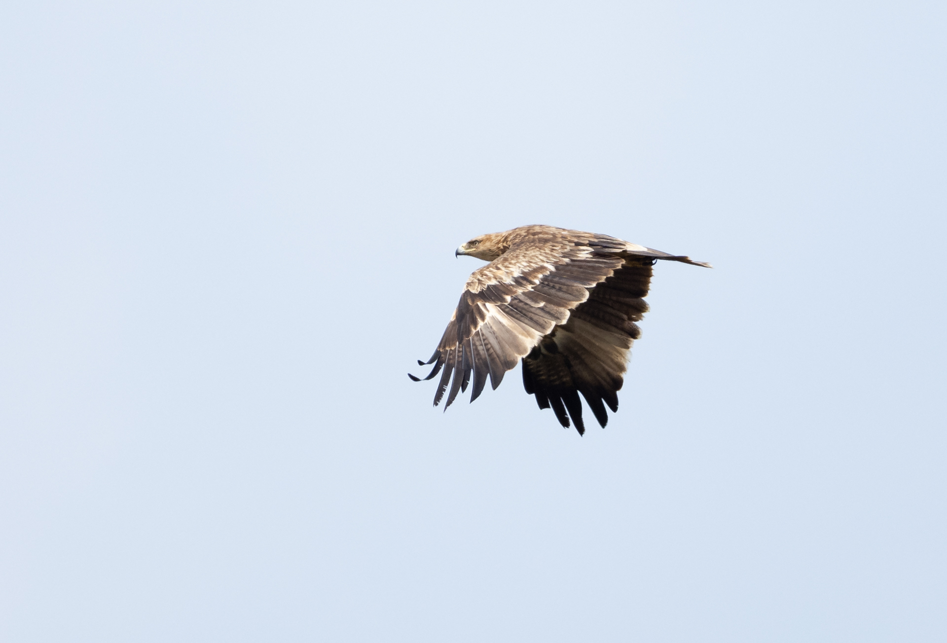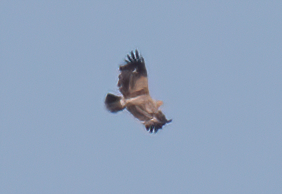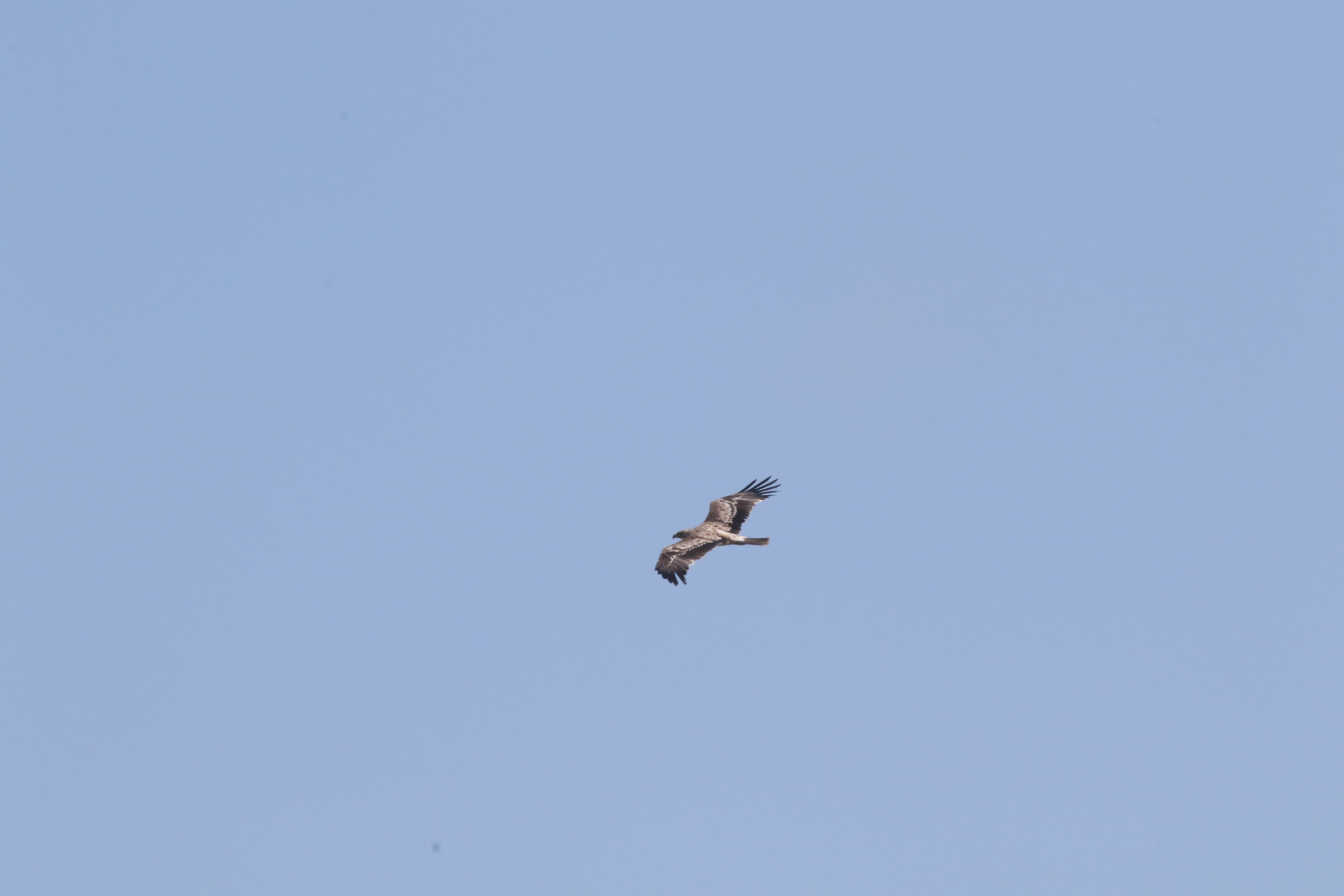Beskrivelse: Kejserørnen kredser sammen med 2k Steppeørn over heden nord for Råbjergvej. Et historisk foto, taget på stor afstand i varmedisen og kraftigt beskåret.