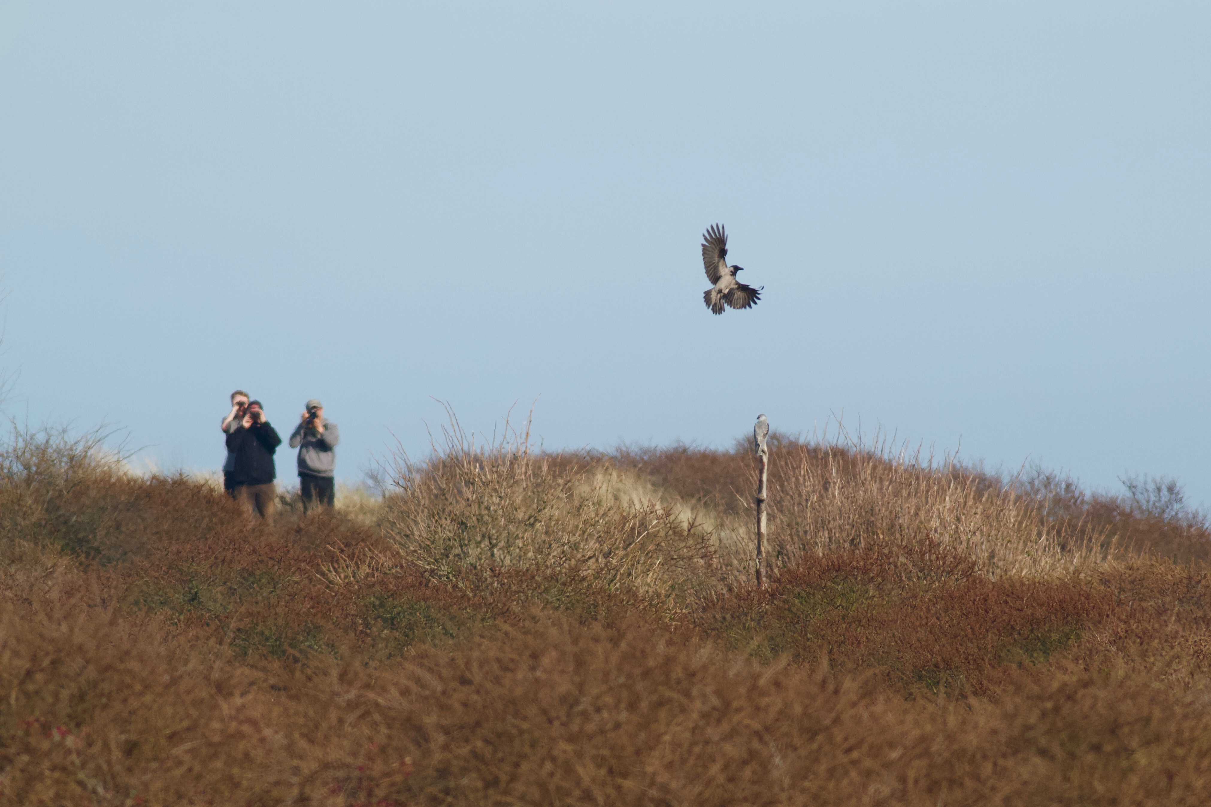 Beskrivelse: Til højre ses de to Aarhusbirdere Stephan Skaarup Lund (SSL) og Rasmus Due Nielsen (RDN) samt længst til venstre ses Kent Olsen (KO), som var finderen af genstanden for dette twitch, nemlig Buskrørsangeren ved Korup Sø, som var den første af to fugle på Djursland i sommeren 2008.