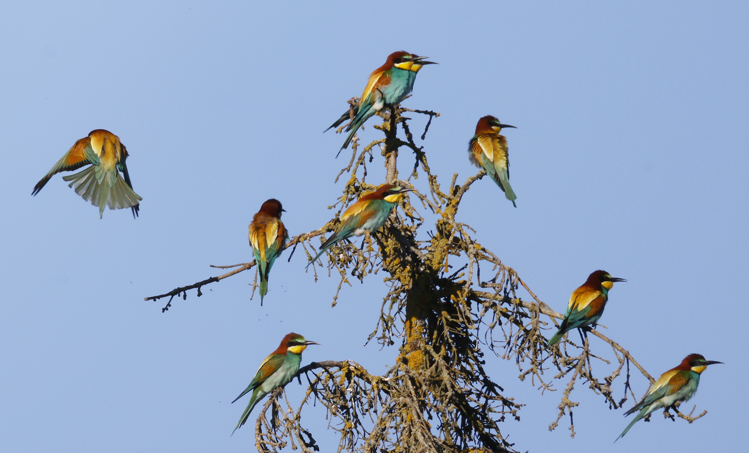 Beskrivelse: Fantastisk oplevelse. 12 biædere rastede i træer ved en mark, hvor de fouragerede før de gik til rast i en nabohave. På dette foto er der 11 biædere, som var det højeste antal, jeg fik på et foto