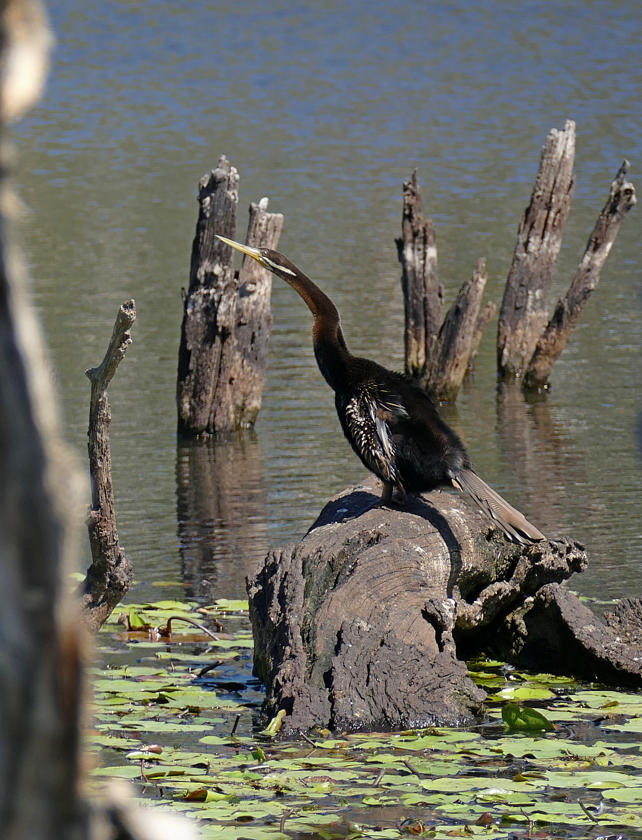 Beskrivelse: Slangehalsfugle minder meget om Skarver, og har bla. også behov for at tørre fjerdragten efter fisketure. Til gengæld kan de spidde fisk under jagten på fisk under vandet, med det spidse næb.