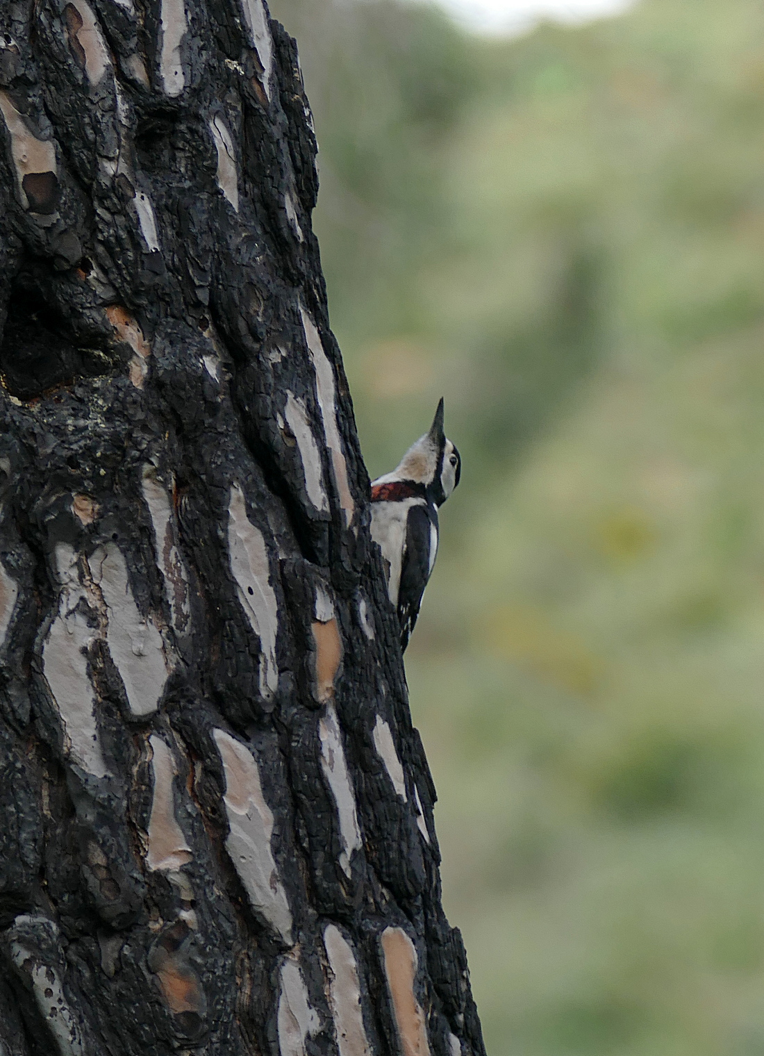 Beskrivelse: Sjældent har jeg set en Stor Flagspætte være bedre camoufleret end i den lettere afbrændte fyrreskov i Djebel el Ouahch-parken.