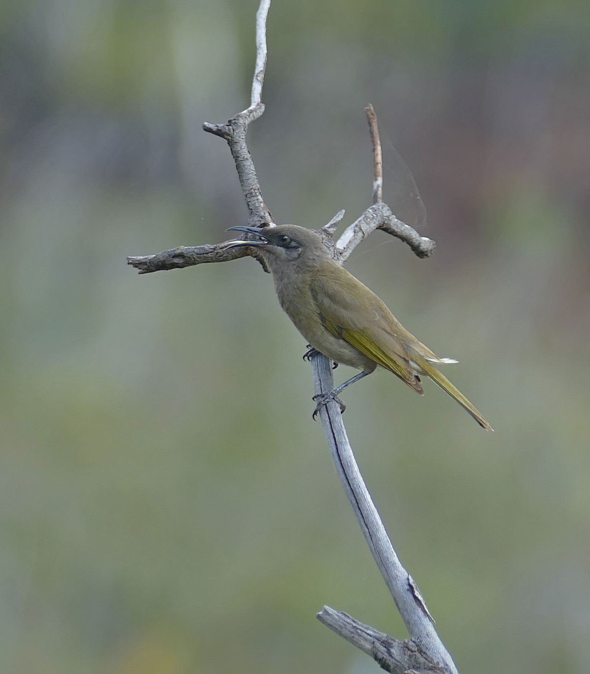 Beskrivelse: Af en Honeyeater, er Grey-eared Honeyeater meget vokal, og da den samtidig er udbredt og almindelig, kan den være ret dominerende i lydbilledet.