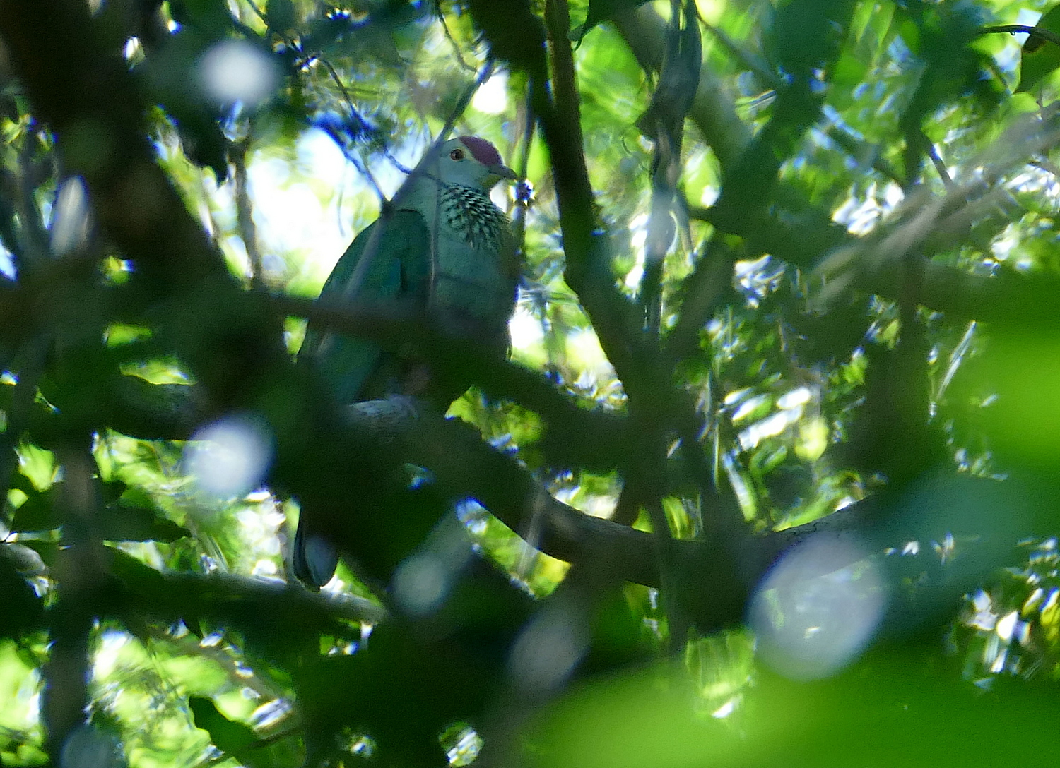 Titel: Red-bellied Fruit Dove calling from inside the canopy.