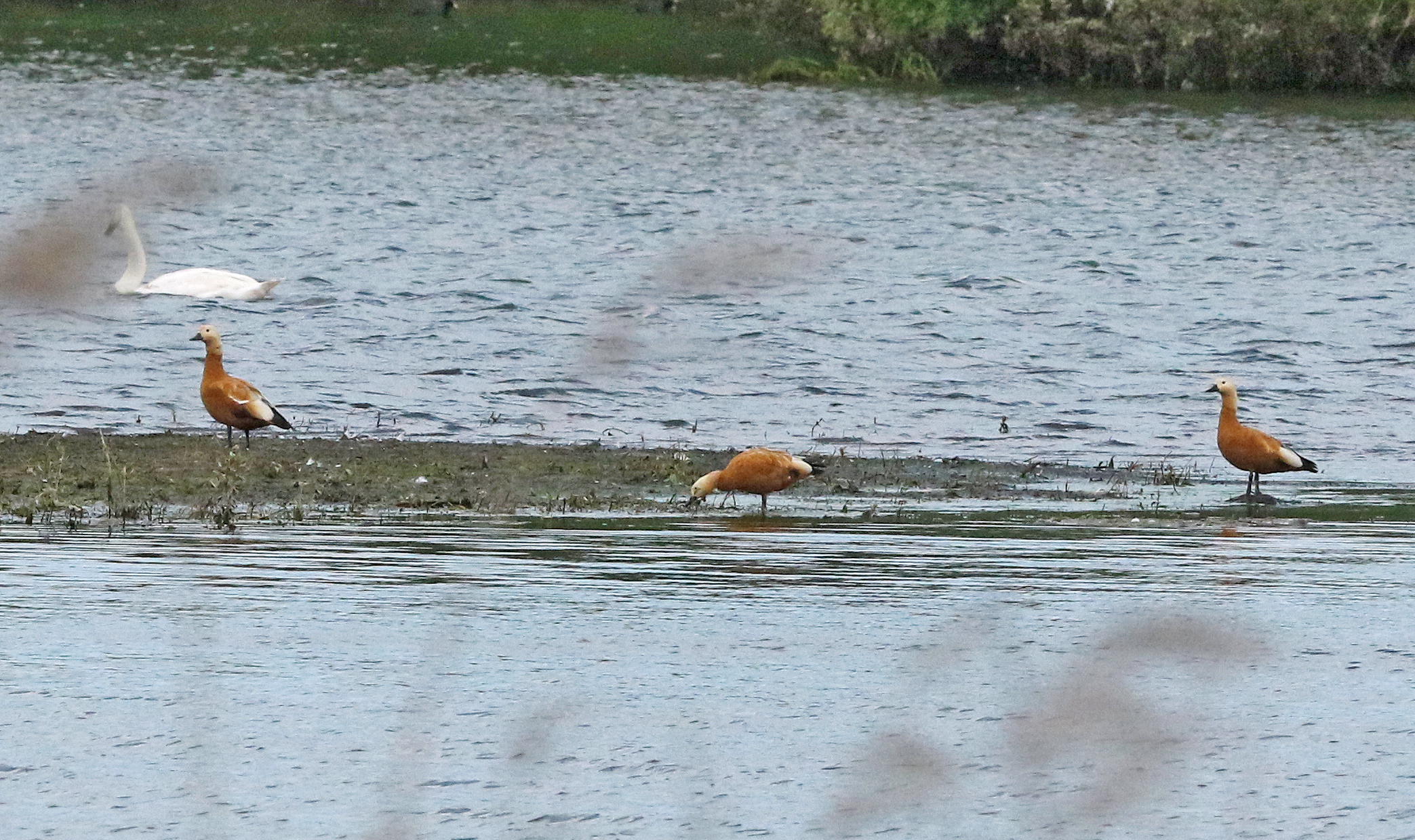 Beskrivelse: Rustænder siddende på sandbanke i Årslev Engsø i midten søen tæt på fugletårnet ...
