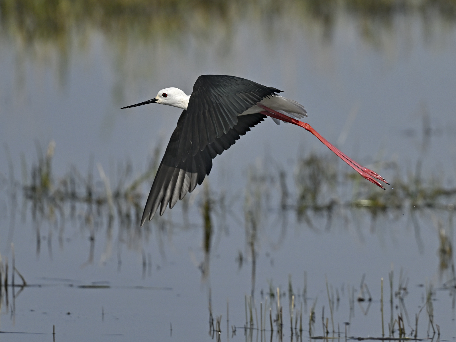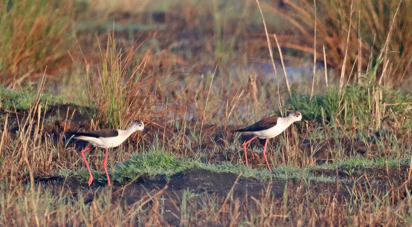 Beskrivelse: To af de i hvert fald op til fire stylteløbere, der i en længere periode blev set i Margrethe Kog og tyske Rickelsbüll Koog. Fuglene var i området i perioden 13.05-10.06. Udover de to afbillede fugle var der en hun og en sortnakket han i området. Foto taget med mobil gennem teleskop.