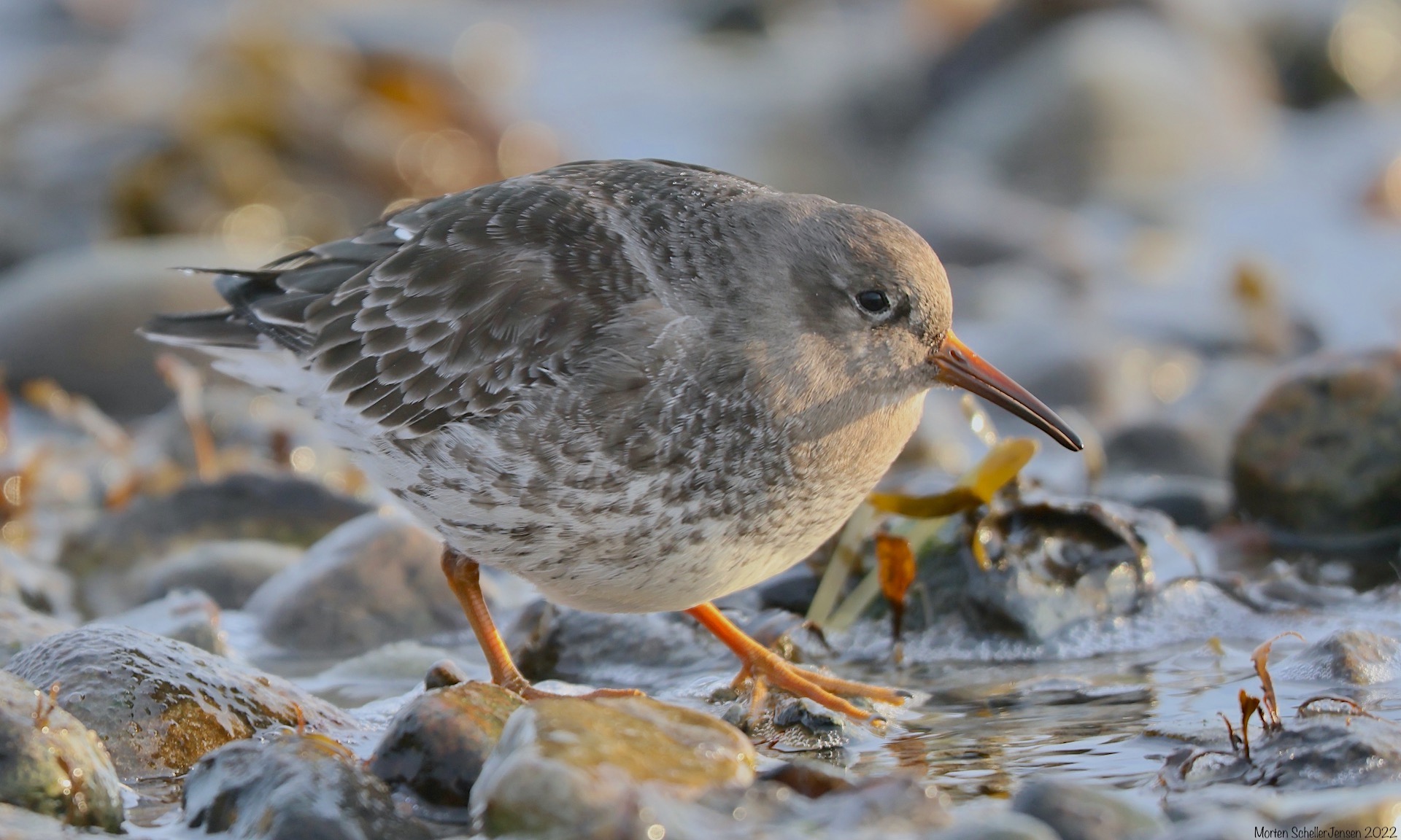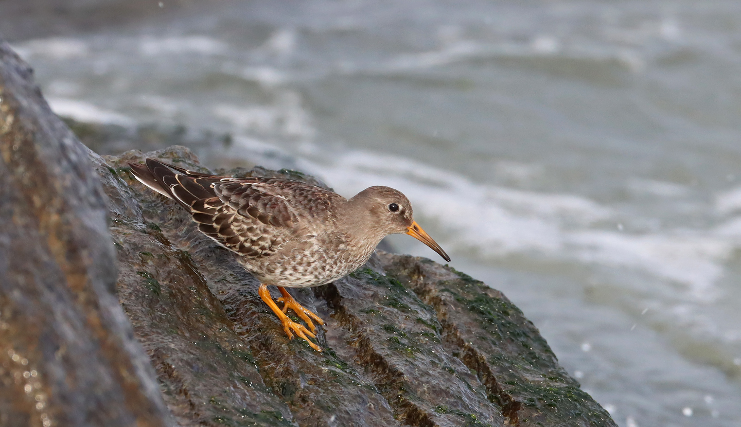 Beskrivelse: Så 15 sortgrå ryler på molen i Hvidesande. Væksterne på stenene siede smådyr fra bølgerne.