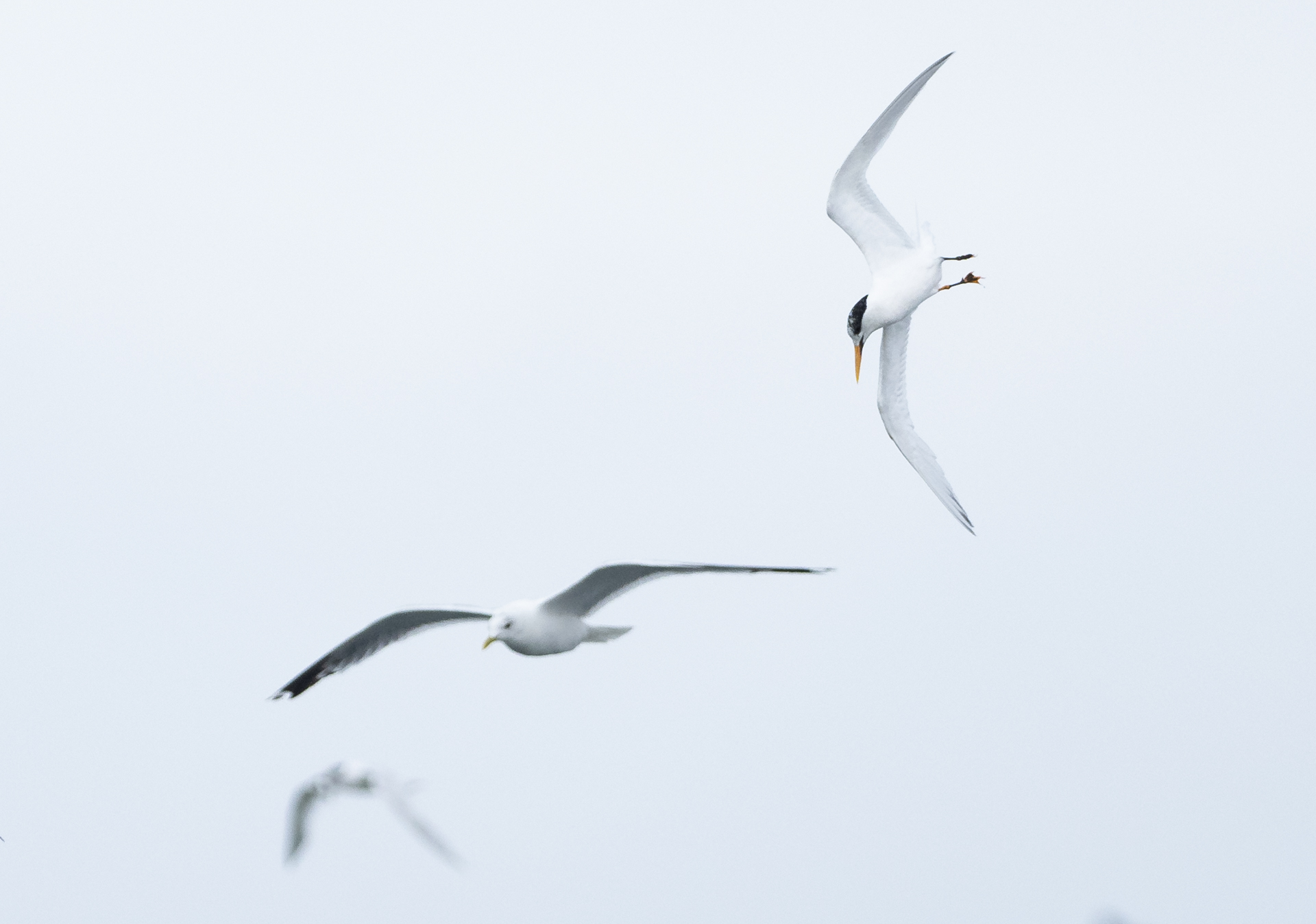 Beskrivelse: Jeg var ikke klar over at jeg fotograferede den omdiskuterede fugl. Der var gang i et sandt "feeding frenzy" af terner, måger, skarver og suler, og jeg fotograferede tilfældigt ind i flokkene. Jeg opdagede til min gru, at den gulnæbbede terne var på tre af mine fotos (opdaget to dage efter). Alle tre fotos er croppet kraftigt.