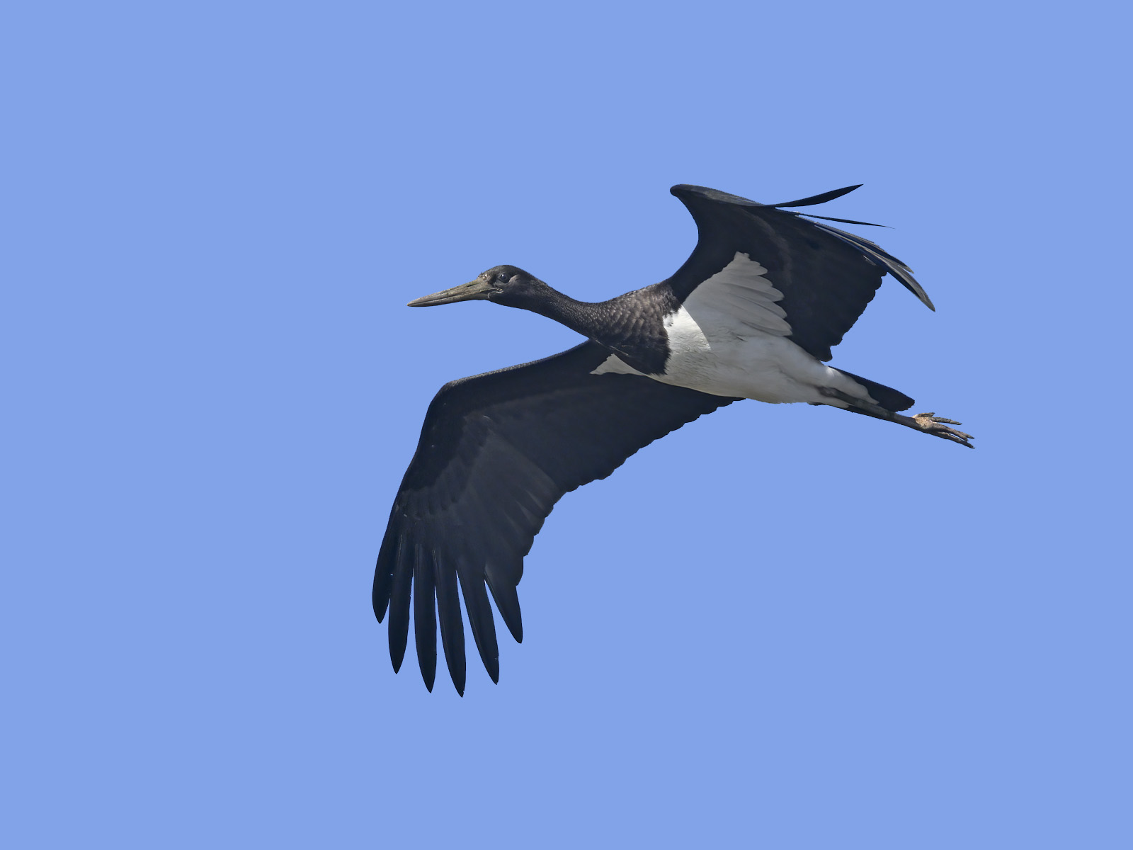 Beskrivelse: En tidlig morgen hvor frosten lå over hele Ekkodalen genfandt vi denne sorte stork som var set kort her aftenen forinden. Den var meget sky og lettede ved blot det mindste.