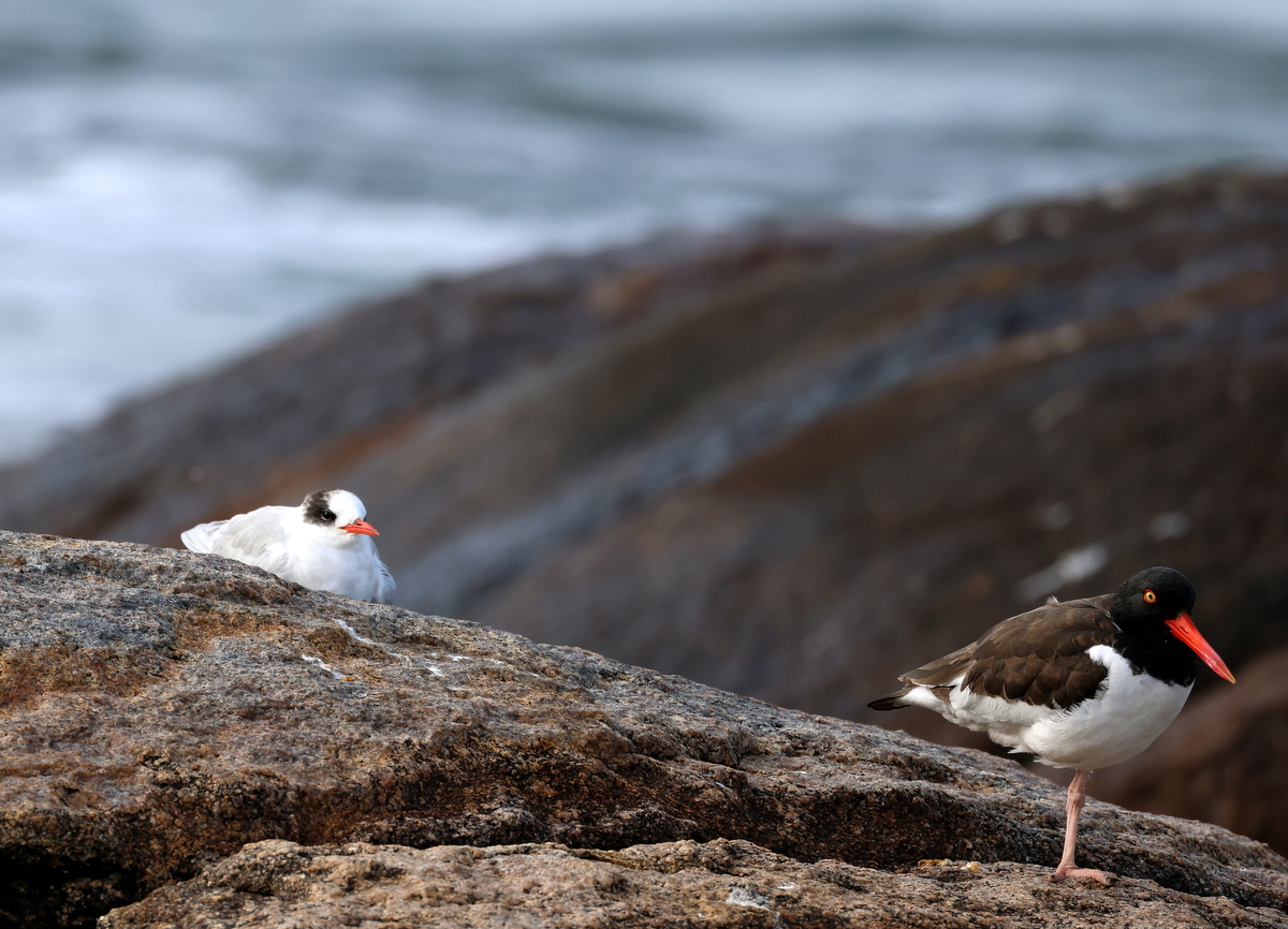 Titel: The tern is about to change plummage for southern summer. The oystercatcher has an ID by the yellow eye/red eye-ring.